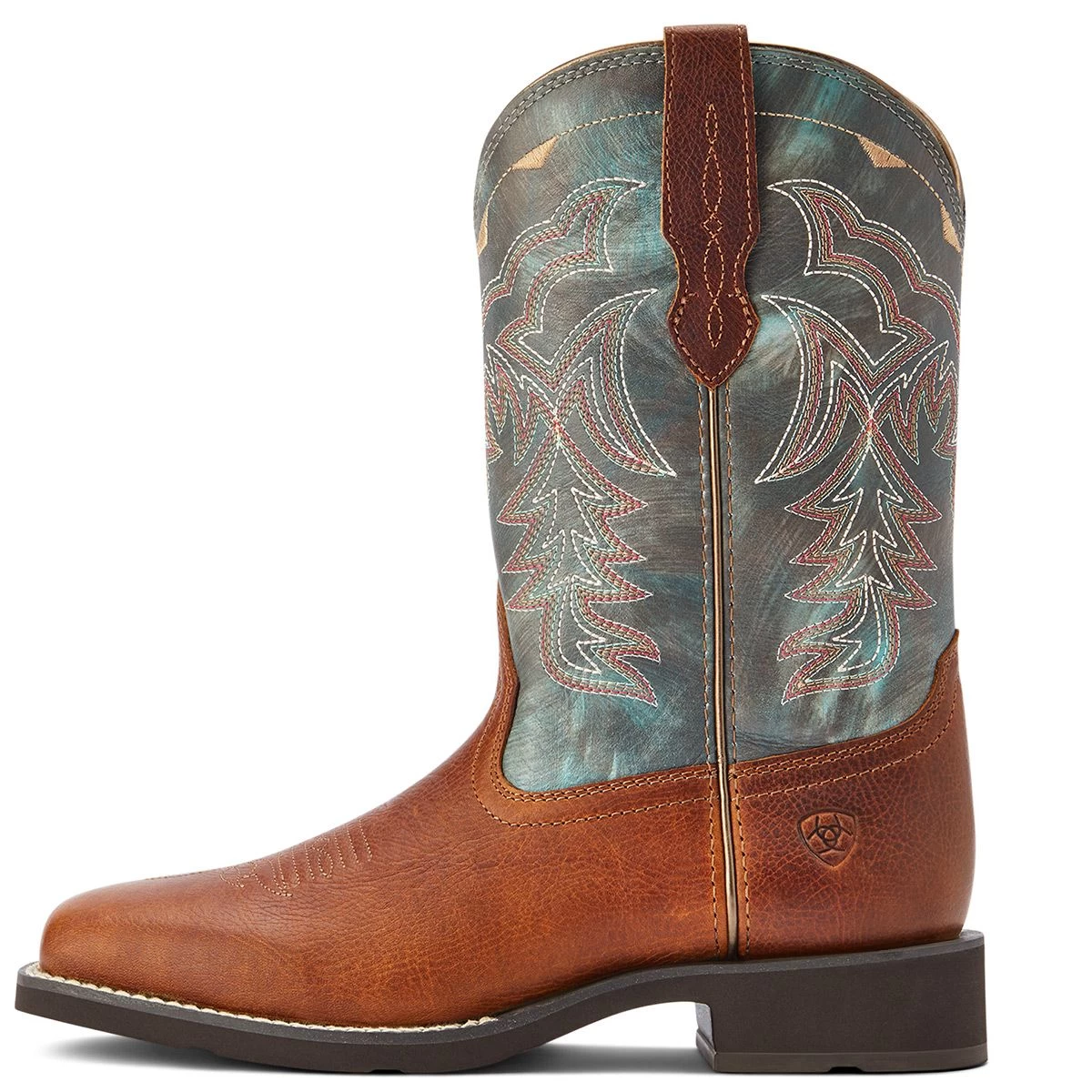 Ariat Delilah Ladies Western Boot from the Heartland Collection in attractive spiced cider with teal river upper offers a unique shimmery pop of color accentuated by colorful complimentary stitching. Ariat’s exclusive Pro Crepe outsole provides optimal wear resistance and cushioning comfort for all day working and riding, while the Duratread heel offers superior traction and durability both in and out of the saddle. The Delilah is beautifully crafted for work and play, easily transitioning from stable to street. Ariat’s Heartland collection combines fashion and function for farm and ranch wear that is designed with comfort in mind .