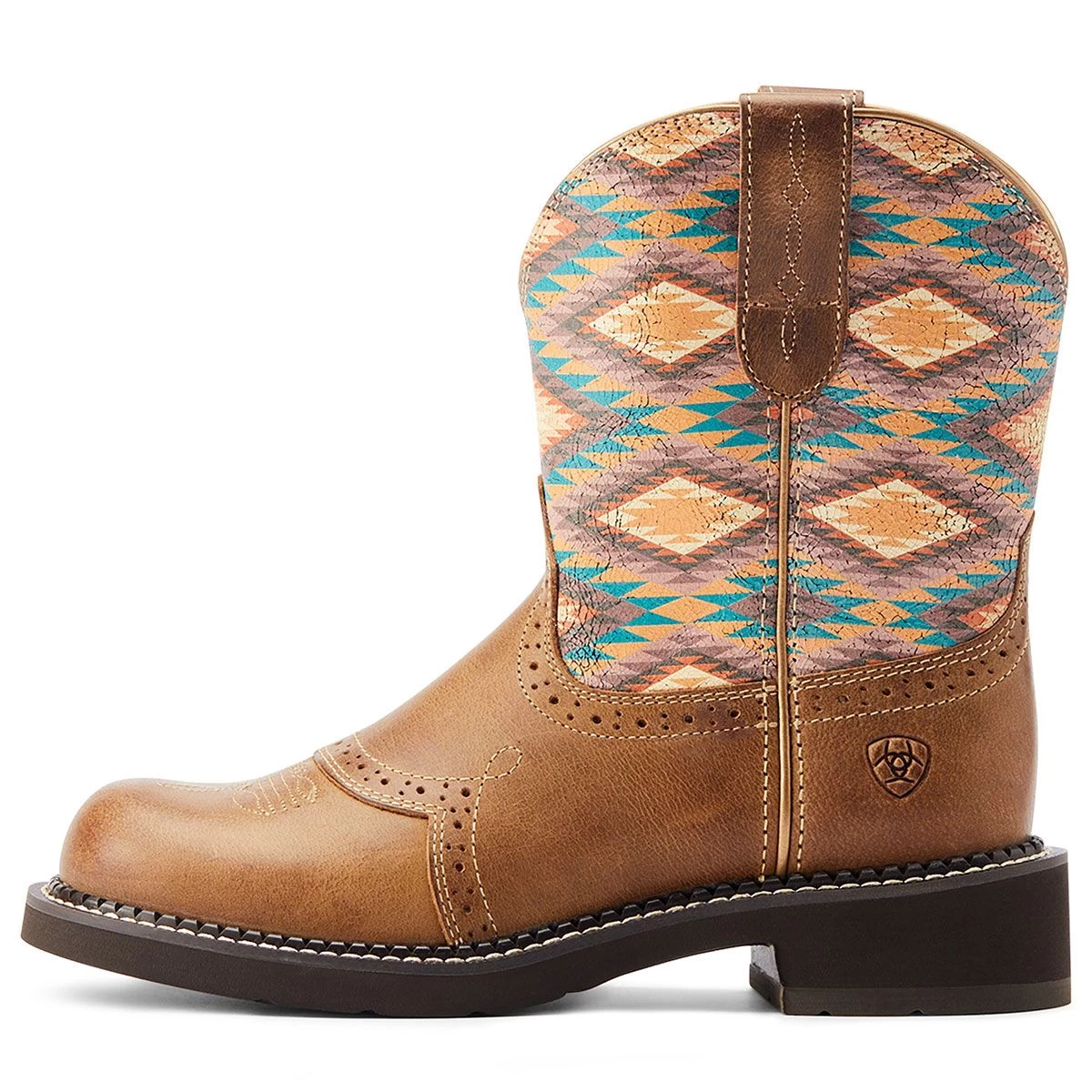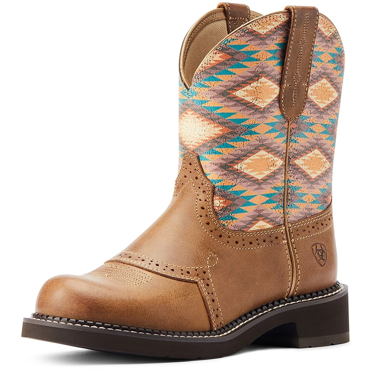Ariat Fatbaby Farrah from the Women’s Heartland Collection offers a perfect combination of enhanced performance features including sculpted outsole profile designed for riding, ATS stability technology, and 4LR contoured cushioned insole with moisture wicking liner. A fun Aztec printed upper on an easy going coastal tan leather foot allows you to put your own unique sense of style to your boot whether in the arena or on the town the Ariat fatbaby offers a uniquely fun style you can call your own.