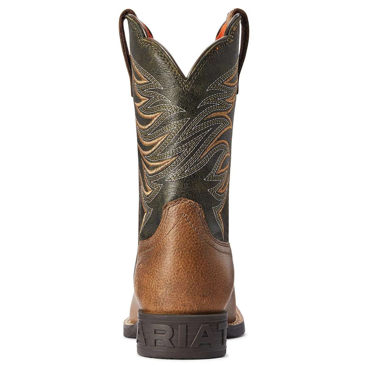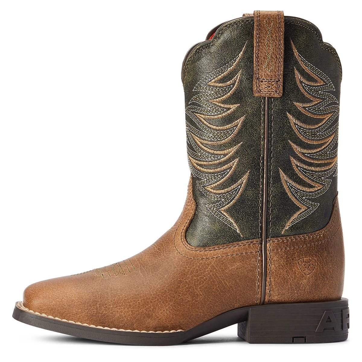 Ariat Firecatcher Youth Western Boot in distressed brown with alfalfa upper from the Ariat Youth Collection is designed with growing kids in mind. Ariat Youth boots feature the wiggle room fit system, allowing their boots to grow with your kids simply remove the insole, peel away the wiggle room insert and insert the insole providing up to a half size of extra room for fit that lasts. Designed for easy fit the topline and upper height provide proportional fit, softer internal components mold and move with your child’s foot while a chubbier outsole accommodates a child’s foot and gait.