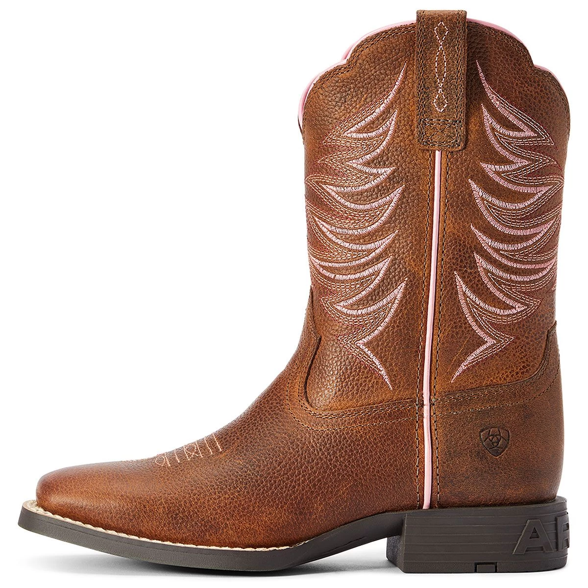 Ariat Firecatcher Girls Western Boot in Rowdy Brown with attractive pink western stitch from the Ariat Youth Collection is designed with growing kids in mind. Ariat Youth boots feature the wiggle room fit system, allowing their boots to grow with your kids simply remove the insole, peel away the wiggle room insert and insert the insole providing up to a half size of extra room for fit that lasts. Designed for easy fit the topline and upper height provide proportional fit, softer internal components mold and move with your child’s foot while a chubbier outsole help to accommodate a child’s foot and gait.