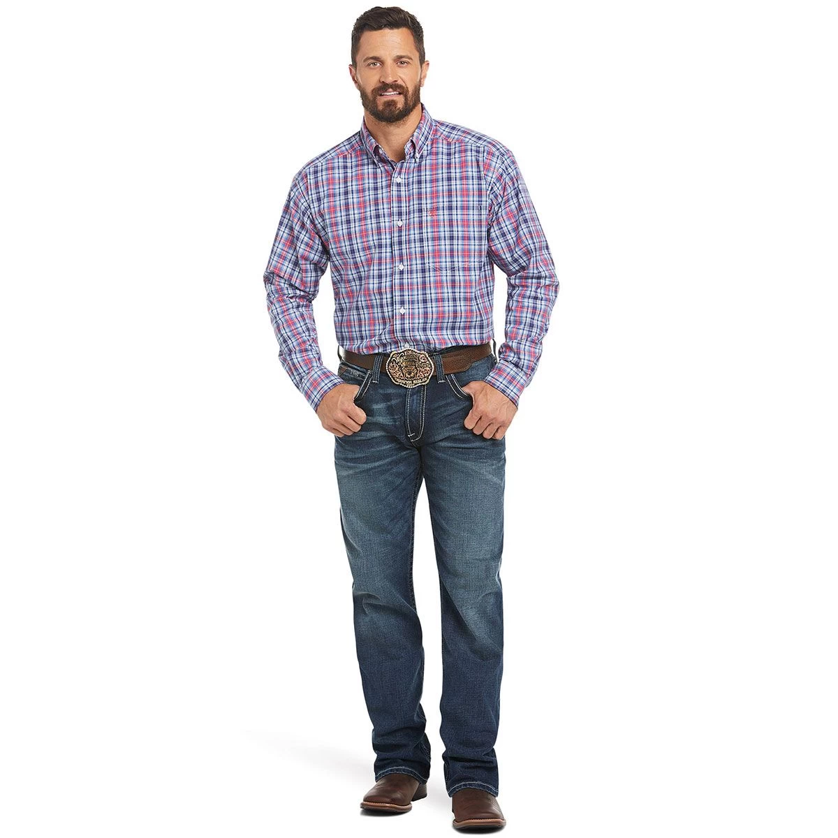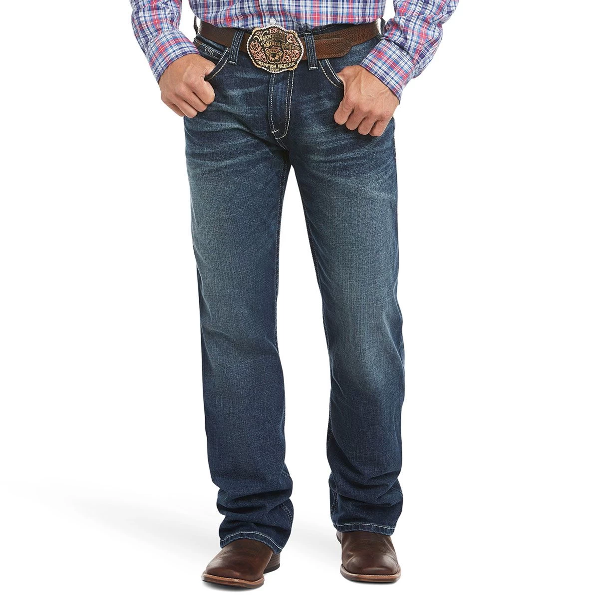 The Ariat M4 Low Rise Stretch Adkins Boot Cut Mens Jeans are a modern take on a classic style. The comfortable and durable 99% Cotton/1% Spandex 13 oz ring spun stretch denim is relaxed through the waist, hip and thigh. These jeans fit lower on the waist, and have anchored belt loops and a no-rub comfort inseam. The heavy-duty zippers and hardware and extra deep front pockets are made to handle the work day. With a classic boot cut, these jeans look good on anyone.