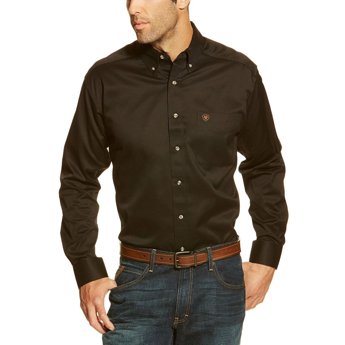 Ariat Solid Twill Black Mens Western Shirt features classic button down in a solid black! Quality construction goes into this oxford with a casual fit, giving it a smooth finish that stays tucked, feels great, and is designed to stand up to rugged hard work at the barn. Under arm gussets for maximum range of motion and extended body length provide a perfectly comfortable fit. A great staple for the show arena, barn, or to layer over a tee, jeans and favorite Ariat boots. Match Dad available in kid’s sizes for coordinated show attire.