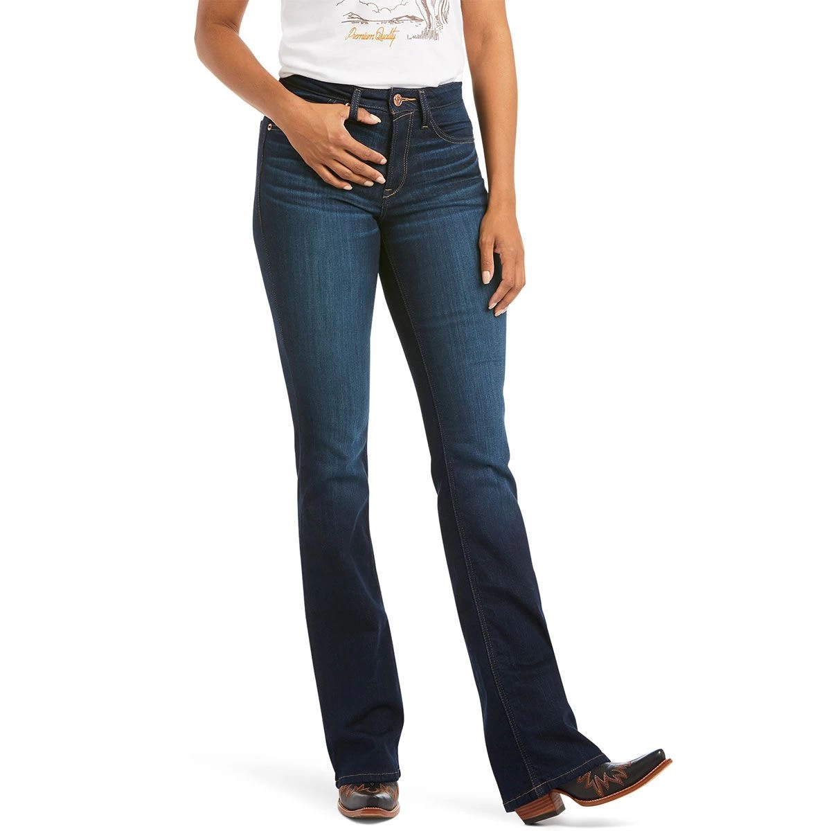 The Ariat REAL High Rise Ballary Boot Cut Ladies Jeans are high rise with a boot-ready flare. These 9.75 oz performance stretch denim jeans are slim through the hip and thigh with a waistband that won’t gap and a seat that won’t sag. The 70’s inspired style is flattering both out on the town or in the saddle. The subtle pocket stitching and dark wash add to the vintage feel.