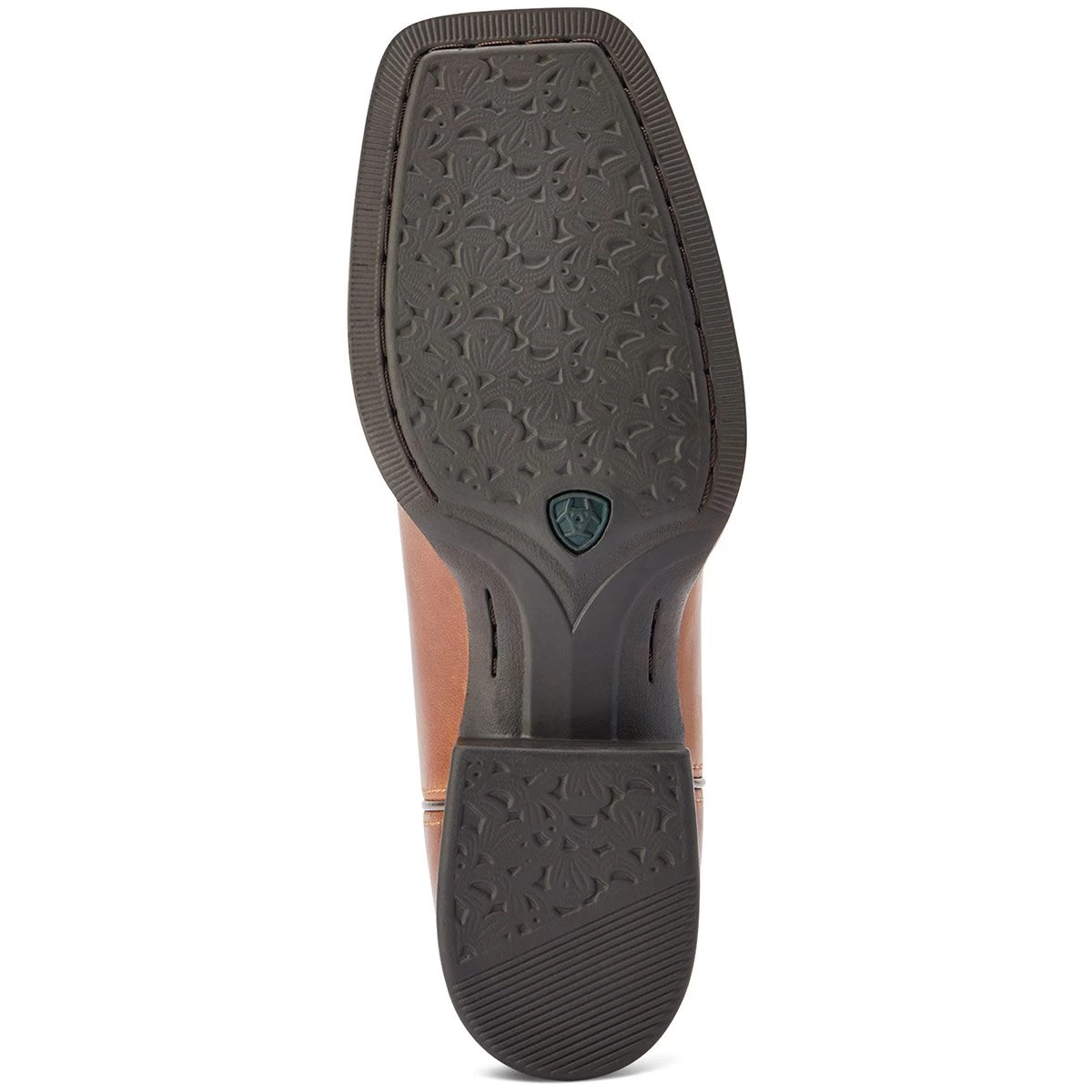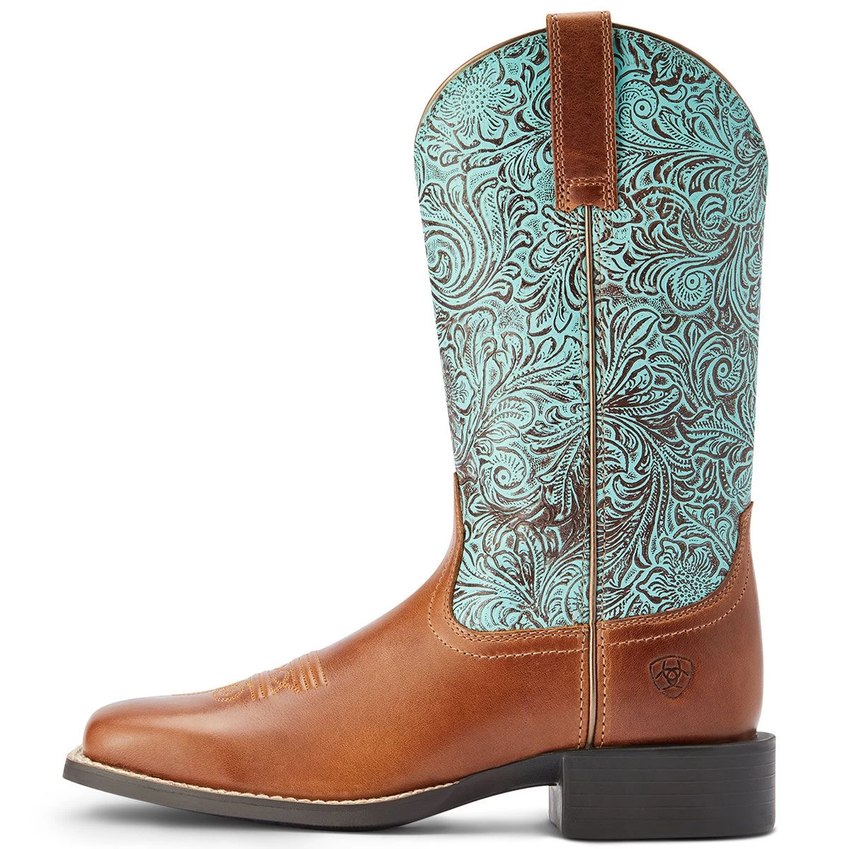 Ariat Round Up Wide Square Toe Ladies Western Boot from the Women’s Performance Collection in rich Beduino Brown features an attractive Turquoise Floral Embossed shaft offering a vintage western look. Ariat’s 4LR technology all day cushioning insole offers lightweight stabilizing support and Duratread maximum wear resistant outsole. The Performance collection is developed with professional riders in mind combining advanced technology features with premium leathers and thoughtful construction. These attractive boots will take you from stable to street with style and ease.