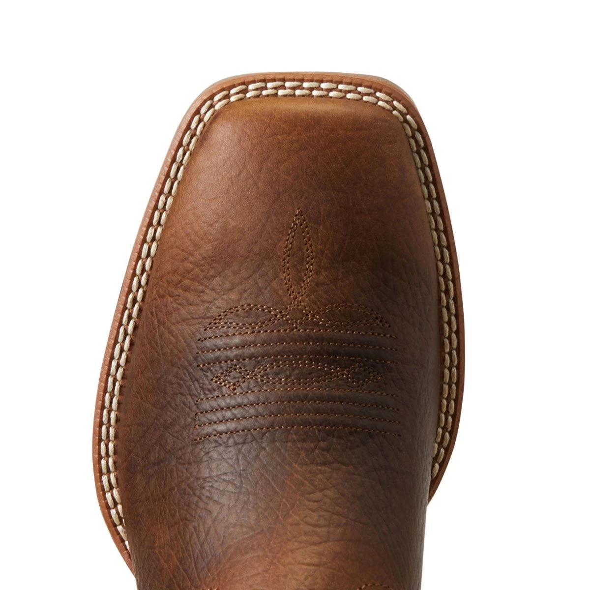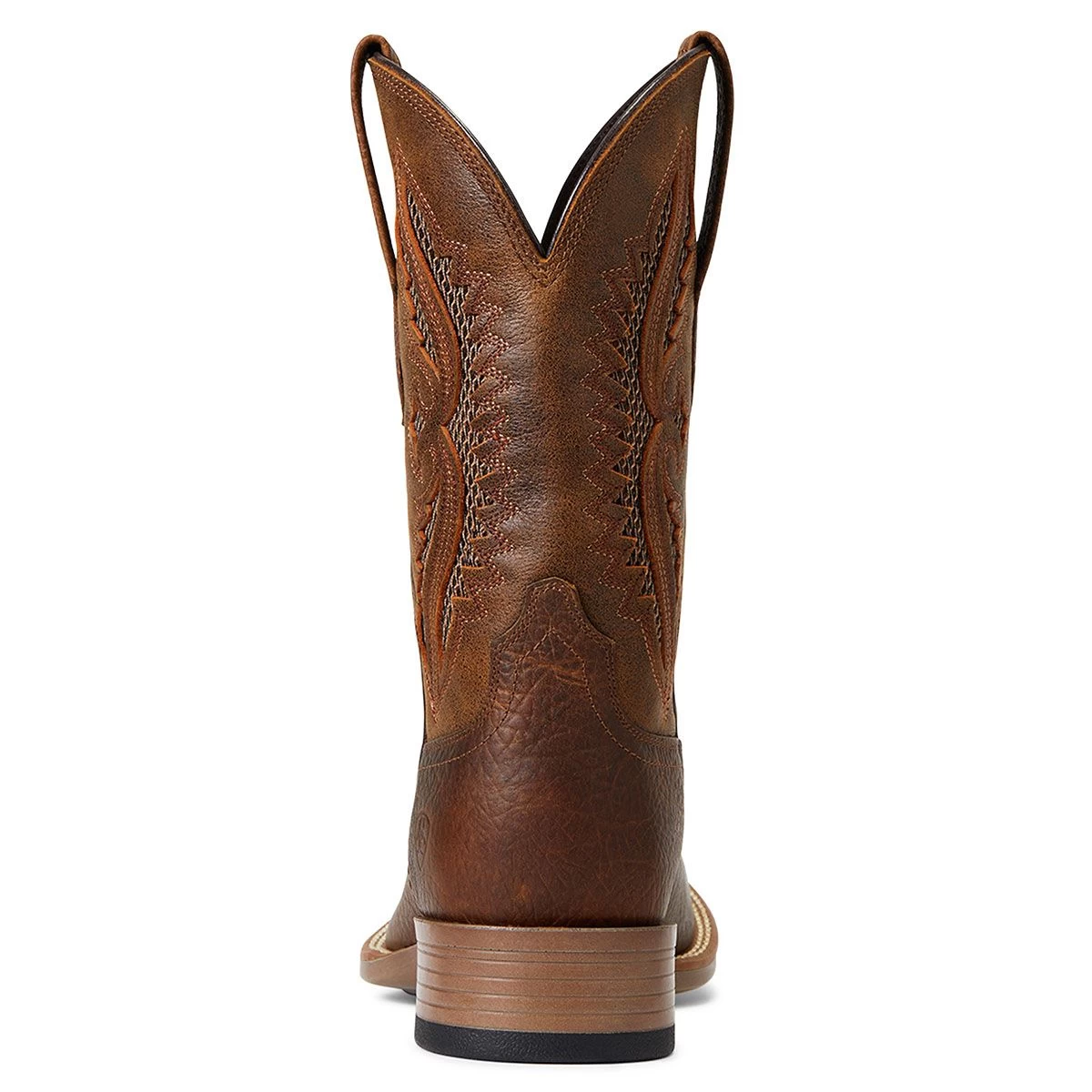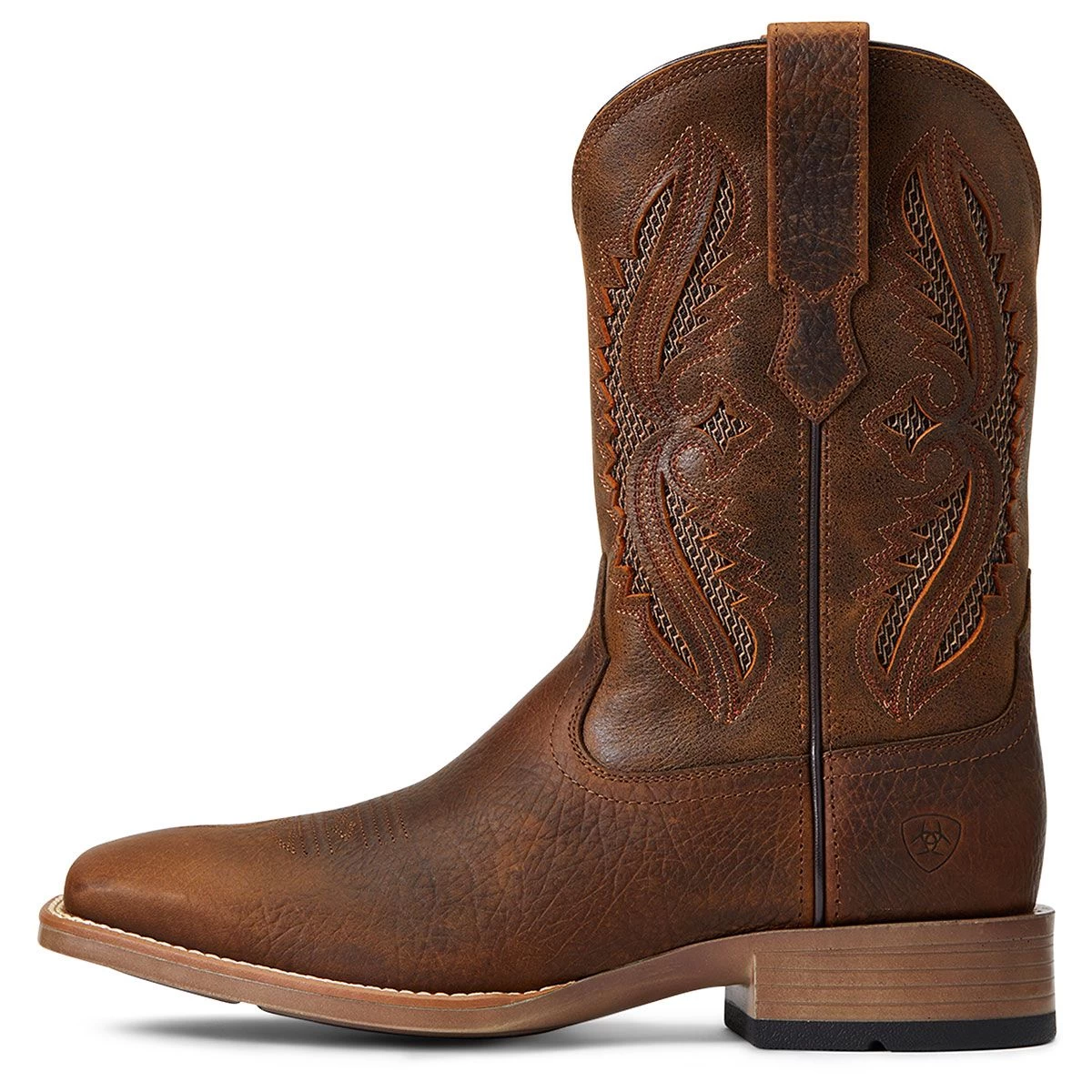Keep your feet cool with the lightweight Ariat VenTek 360 Rowder Mens Western Boot in Mack Brown. These leather boots have breathable mesh panels and DryFreeze temperature regulating lining. With an easy pull on style, these boots feature a contoured All Day Cushioning insole and for the outsole a durable and lightweight flexible Bantamweight . Perfect for all day riding and barn work, choose these Ariat boots to keep your feet happy.