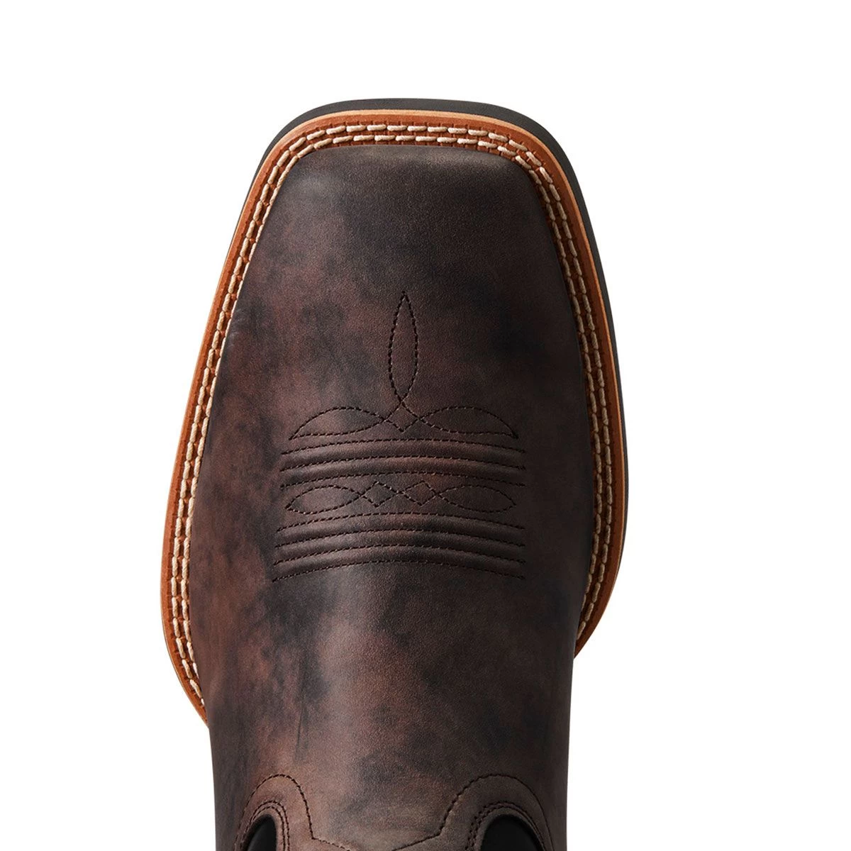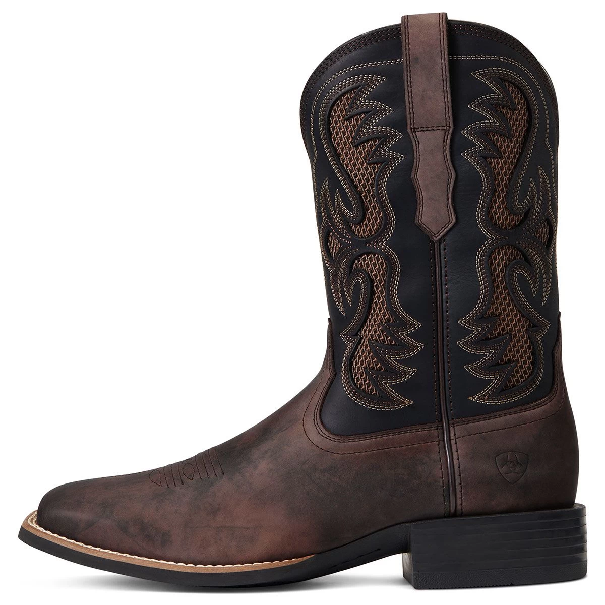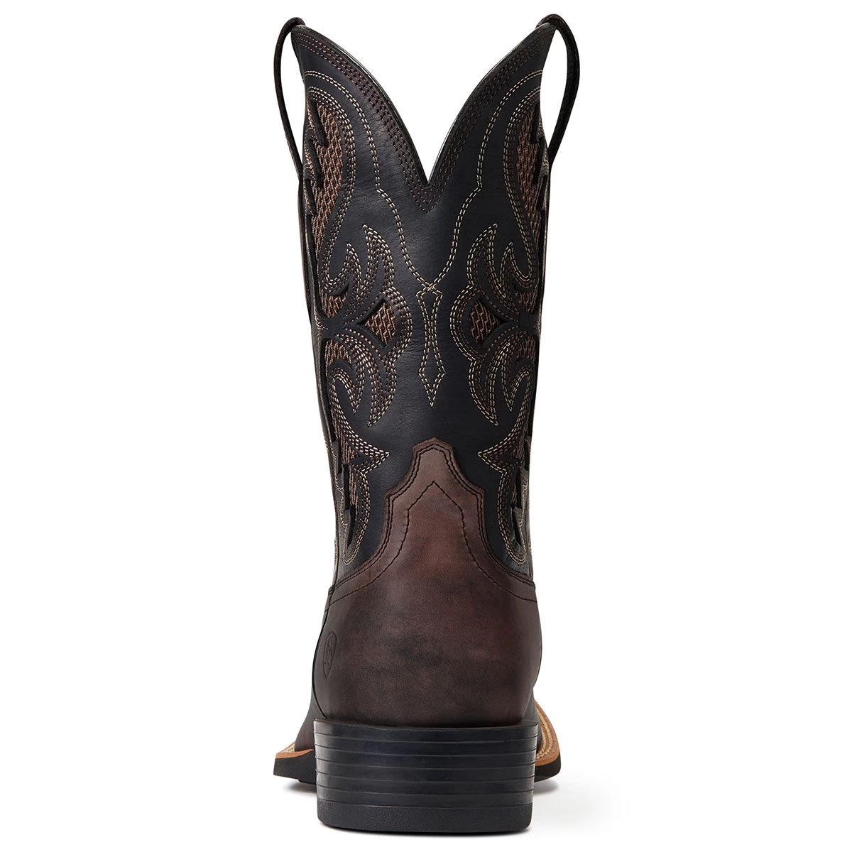 The Ariat Sport Fresco Venttek Mens Western Boot in Tan/Black Ink will have you in comfort and style all day. Either at the barn or in the saddle, this leather boot has Venttek mesh panels and a synthetic air mesh lining for breathability. In an easy pull on style and open cell cushioning on the foot bed. These Fresco boots will be your new go to shoe in the warmer months.