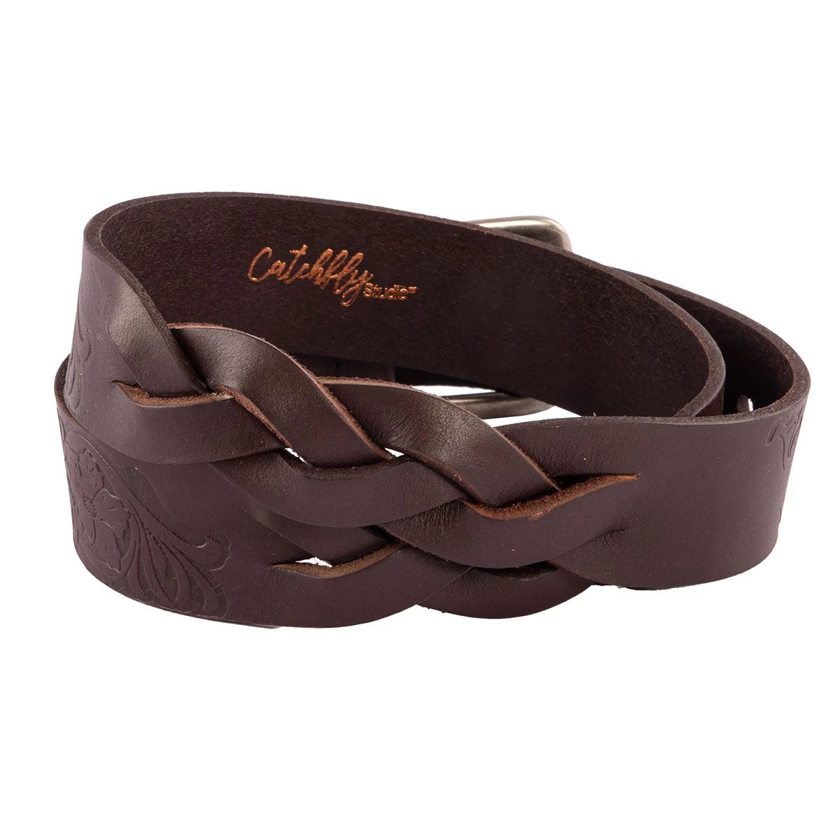 The Catchfly Tooled and Laves Ladies Belt in Brown Leather is a 100% genuine leather belt. With lacing detail and embossed floral patterns and an antique nickel buckle, this belt style is classic yet still western.