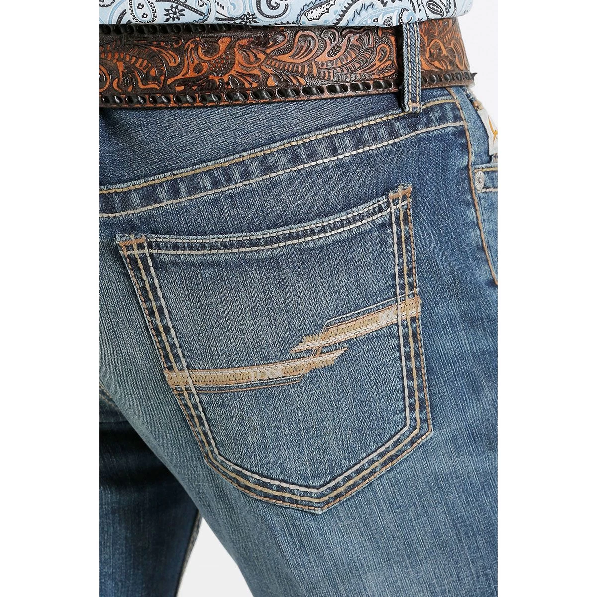 The Cinch Ian Dark Stonewash Mens Jeans are a mid rise, slim, boot cut jeans in a dark stonewash that is attractive and versatile. The 10.2 oz performance stretch denim features heavy finishing details including tint, hand sanding, whiskers, chevrons and knee starbursts for a combination of style and comfort. The back pocket embroidery details and unique, yet still subtle. These jeans can be worn dressed up or down, in the saddle or out.