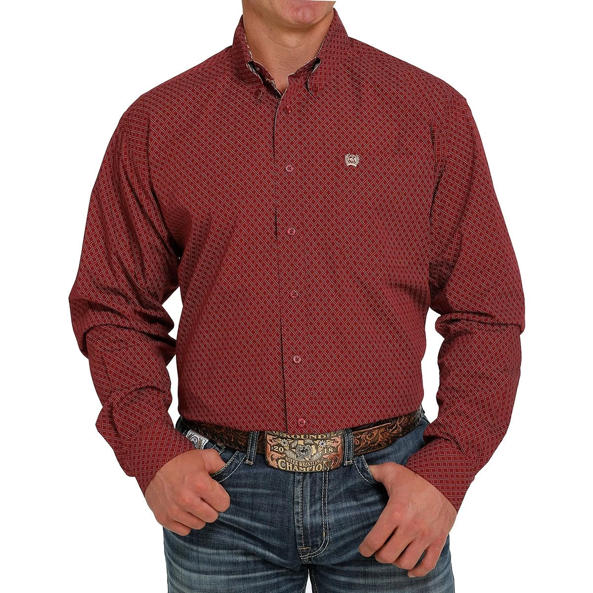 Cinch Mens Geo-print Button Down in deep red printed cotton weave with diamond geometric print. This classic fit Cinch mens western shirt pairs perfectly with your favorite jeans and boots. A great way to level up your personal style in the arena and on the town.