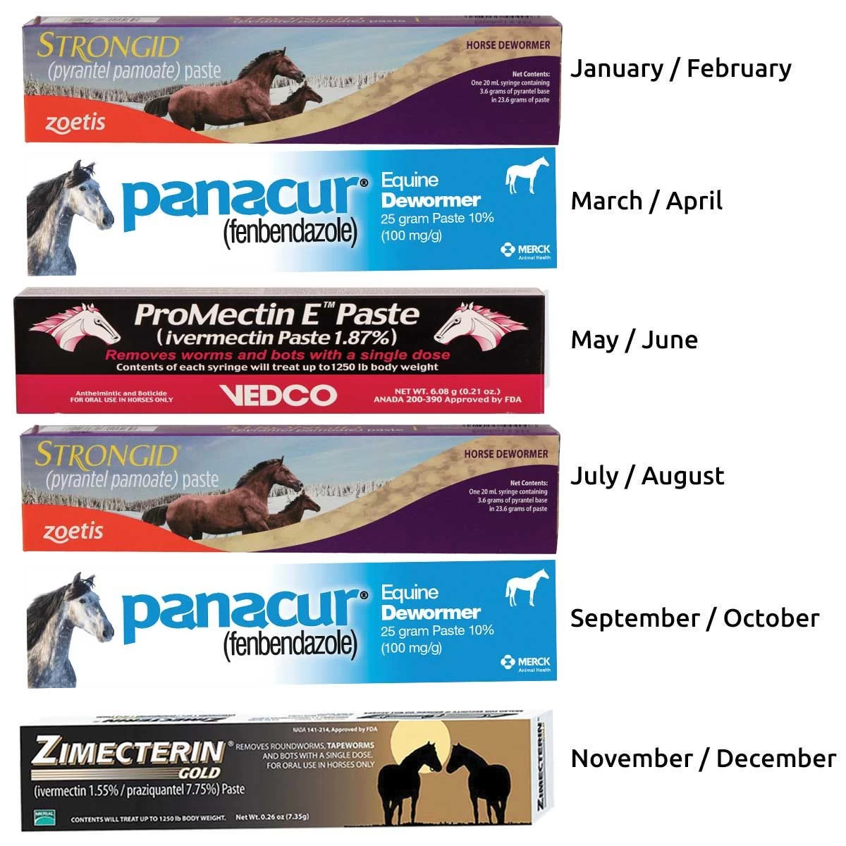 - Now you can easily protect your horse year round and minimize parasite resistance with proper rotational deworming.