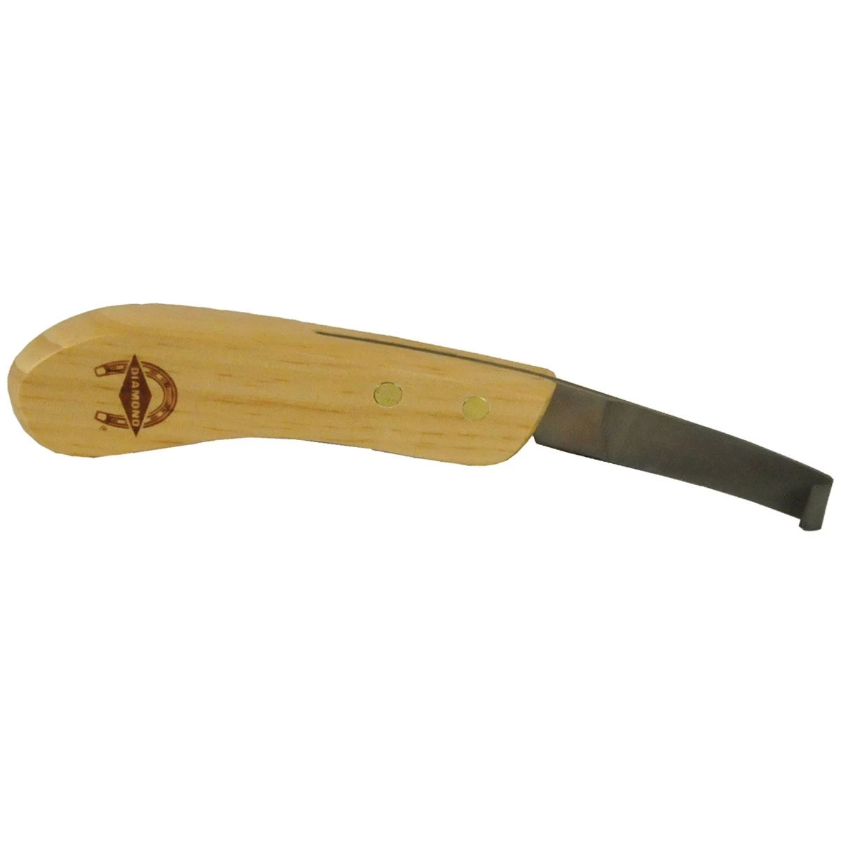 Wood handle wide blade used for trimming horse feet for a right handed blacksmith.