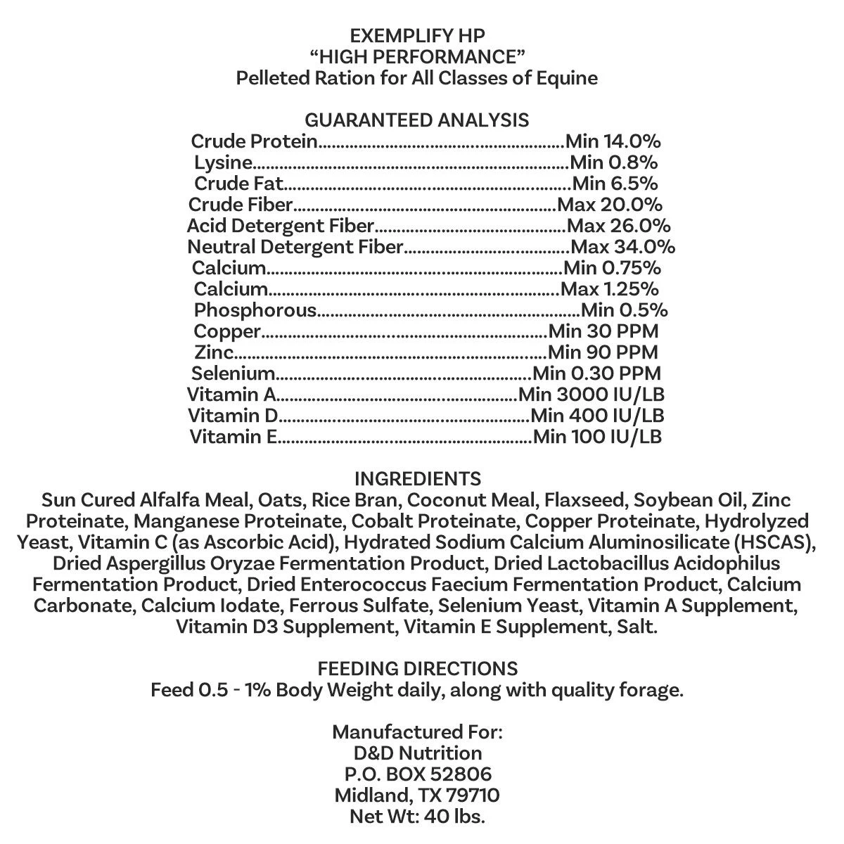 Exemplify HP from Dove Performance Nutrition is an ultra premium feed with the performance horse in mind. Top quality formulation combines Coolstance coconut meal, whole oats, sun cured alfalfa, rice bran, and milled flax seed. Coolstance is a high fiber, low sugar energy source that is easily digestible. Whole oats are packed with nutrient dense energy to help enhance fast-twitch muscles during competition or exercise. Alfalfa and rice bran provide additional protein and fiber, as well as many essential vitamins and minerals in a very palatable form. Rice bran also contains more than 120 known naturally occurring antioxidants. Milled flax seed (high in Omega 3 fatty acids) touts a multitude of benefits such as improved hoof quality and growth, shines coats and reduces skin issues, acts as a natural anti-inflammatory, all while improving the digestion of fiber in the diet. The addition of soy oil offers an excellent balanced source of Omega 3 and 6 fatty acids. Top of the line nutraceuticals such as Bio-Mos prebiotic, organic chelated trace minerals, and probiotics work together to have your horse looking and feeling their best by optimizing absorption. Exemplify HP is a high protein, moderate fat level formula ideal for the equine athlete.