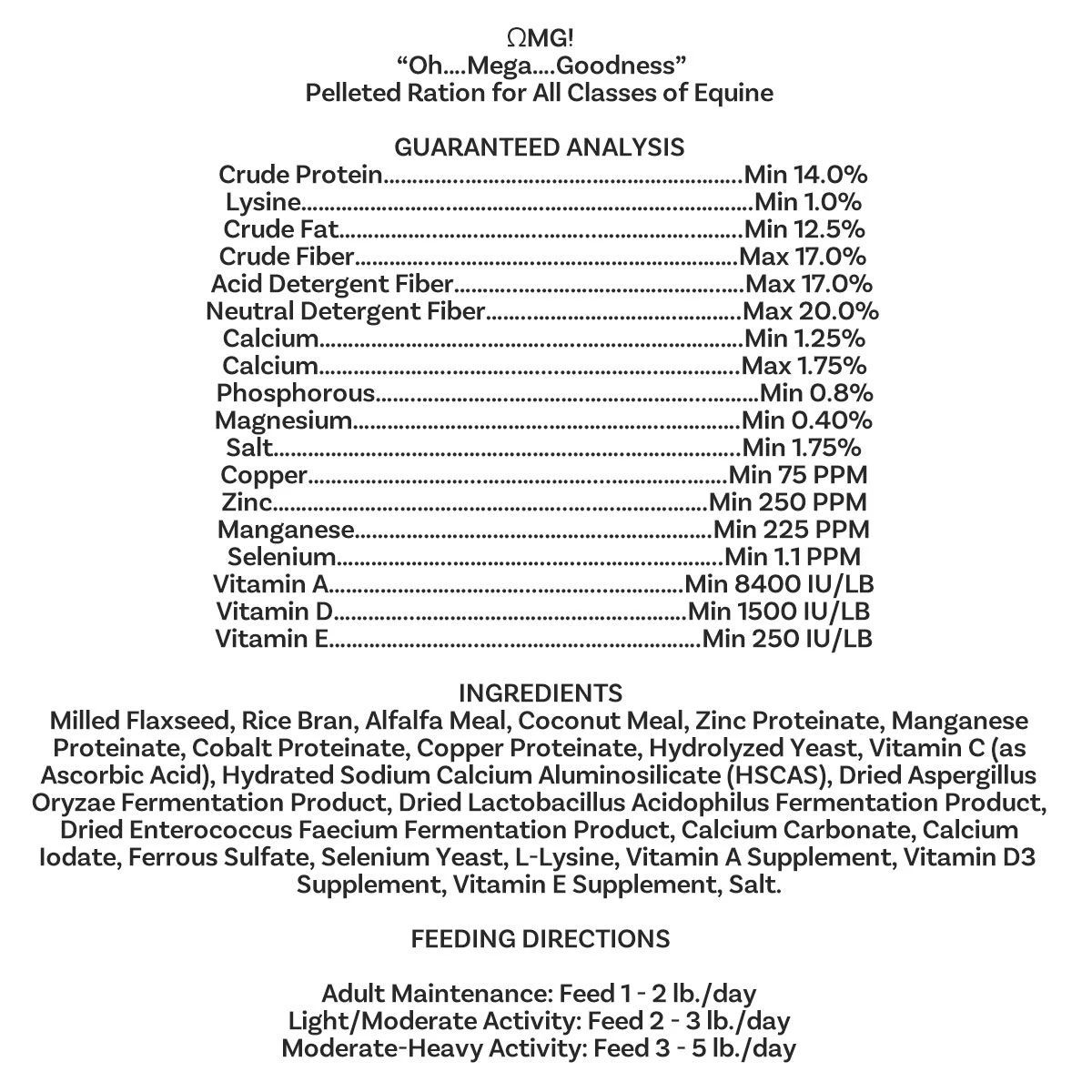OMG Omega Goodness from Dove Performance Nutrition is a high protein high fat ultra premium feed. Ideal for hard keepers or the active performance horse. Top quality formulation of Coolstance coconut meal, sun cured alfalfa, rice bran, and milled flax seed. Coolstance is a high fiber, low sugar energy source that is easily digestible. Alfalfa and rice bran provide additional protein and fiber, as well as many essential vitamins and minerals in a very palatable form. Rice bran also contains more than 120 known naturally occurring antioxidants. Milled flax seed (high in Omega 3 fatty acids) touts a multitude of benefits such as improved hoof quality and growth, shines coats and reduces skin issues, acts as a natural anti-inflammatory, all while improving the digestion of fiber in the diet. Top of the line nutraceuticals such as Bio-Mos prebiotic, organic chelated trace minerals, and probiotics work together to have your horse looking and feeling their best by optimizing absorption. Can also be fed as a top dress to your existing feeding program for improved body condition and weight gain.