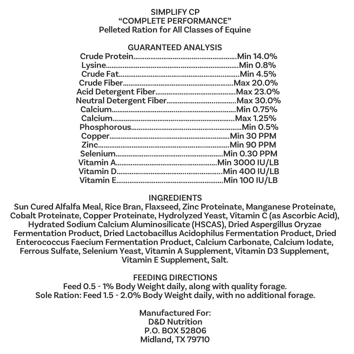 Simplify CP from Dove Performance Nutrition is an ultra premium feed ideal for easy keepers or horses with lower activity levels. Formulated with top quality ingredients such sun cured alfalfa, rice bran, and milled flax seed — no soy or wheat. Alfalfa and rice bran provide quality protein and fiber, as well as many essential vitamins and minerals in a very palatable form. Rice bran also contains more than 120 known naturally occurring antioxidants. Milled flax seed (high in Omega 3 fatty acids) touts a multitude of benefits such as improved hoof quality and growth, shines coats and reduces skin issues, acts as a natural anti-inflammatory, all while improving the digestion of fiber in the diet. Top of the line nutraceuticals such as Bio-Mos prebiotic, organic chelated trace minerals, and probiotics work together to have your horse looking and feeling their best by optimizing absorption.