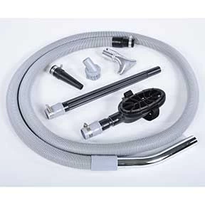 - Includes 10′ crushproof hose, swivel end, aluminum serrated nozzle, brush, and blower tip. Hose can also be attached to exhaust port to blow away dust and debris.
