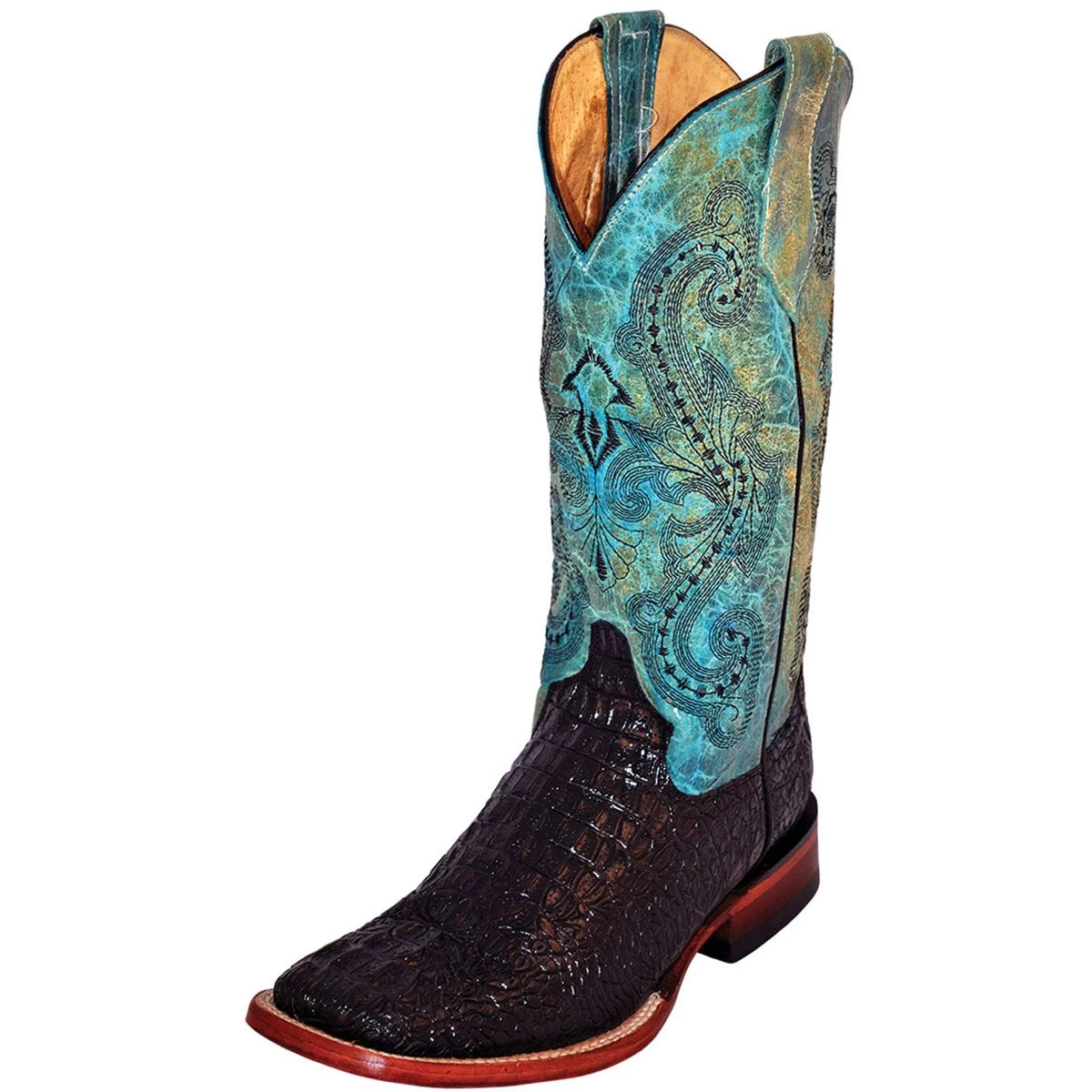 Ferrini Stampede Ladies Western Boot offer an exotic look in caiman crocodile cowhide print leather in rich black with distressed turquoise leather shaft accented by beautiful western stitch. From the arena to the concert venue these these handcrafted boots are ideal for any occasion with a perfect combination of exotic beauty and comfort. Ferrini boots offer classic, authentic western style that is both beautiful and affordable while providing all day wearing comfort and durability. Each pair of Ferrini boots is hand-stitched with rich leather uppers, permium soles, orthopedic footbeds and full leather lining for beauty that is built to last.