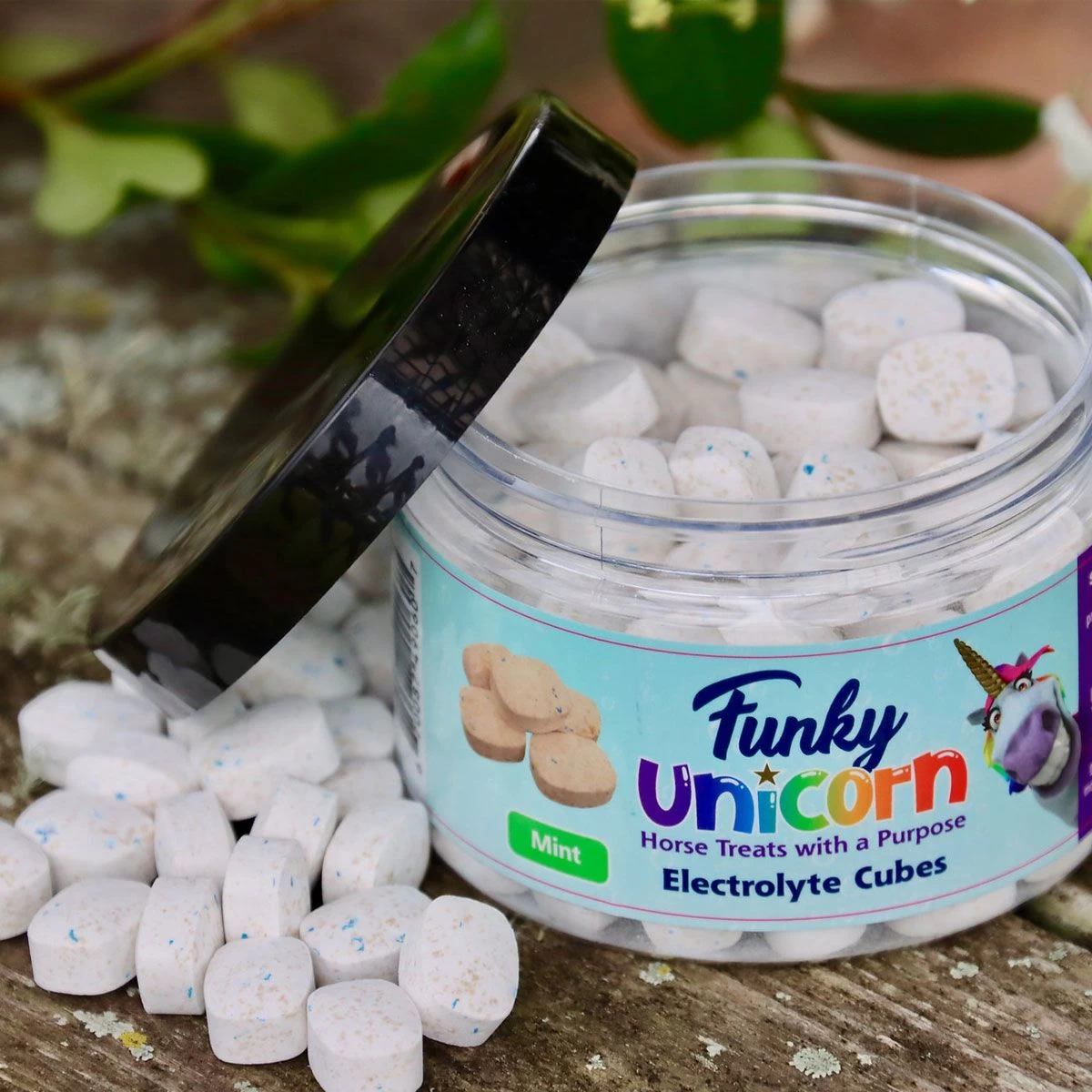 Funky Unicorn Electrolyte Cubes are a horse treat with a purpose! The small dose of electrolytes found in each cube help to trigger thirst for proper hydration. An effective aid to make sure your horse is staying sufficiently hydrated during times of stress such as horse shows or events, after trailering, or during changes in weather. These scrumptious treats entice picky water drinkers and are safe for every day use. Three delicious flavors available for the most discriminating of equines.