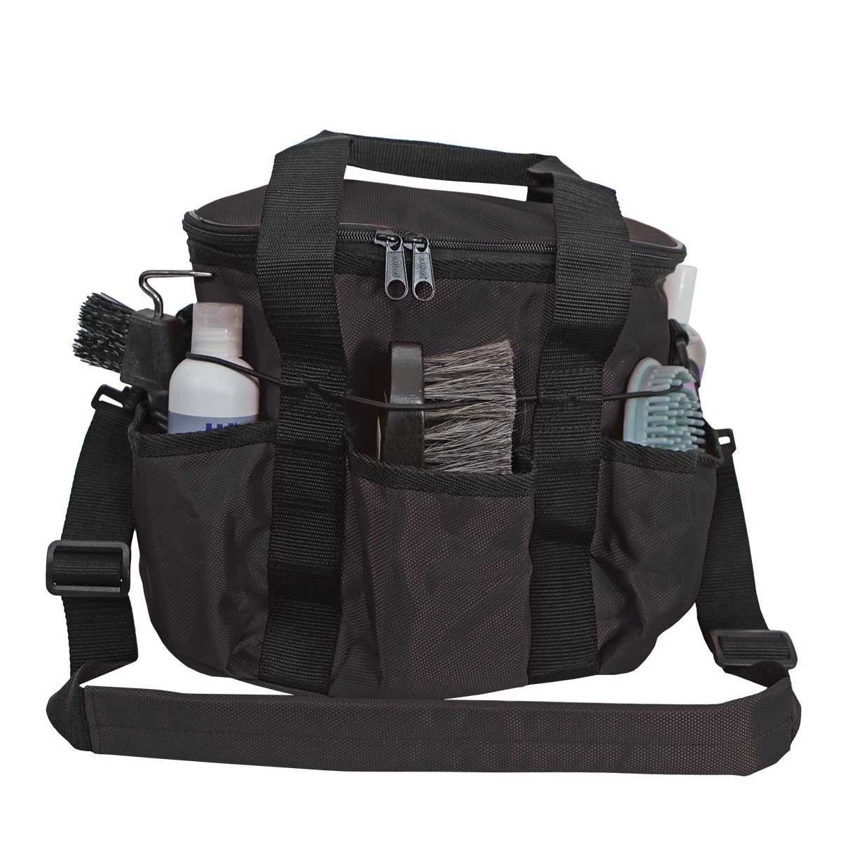 Grooming tote bag with a zipper lid is great for traveling, in the trailer or just to have in the barn. Outside pockets for storing items that you need at the ready. Convenient shoulder length carrying strap, that also comes off. Customize this tote bag with your own 6 inch logo or monogram on the top (additional charge). Brushes sold separately.