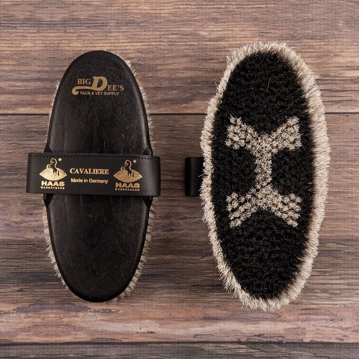 The #1-selling Haas brush! This quality, stylish brush is engineered to last for years and create a dazzling finish. Made with genuine horse hair and durable resin base create a body brush that is sure to lift dirt, loose hairs, and dander from your horse’s coat. A comfortable leather hand strap is cleverly incorporated into the body of the brush, avoiding the use of nails or glue for increased longevity and prevents injury to horse or rider. The slightly raised edges of the longer border maximize cleaning results, revealing a soft, shiny coat. Use after your favorite Haas curry and before your Haas Diva Brush for a blue-ribbon turnout! Made in Germany.