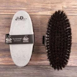 The Haas Schimmel Stiff Brush is specially designed for the horse that tends to get really muddy (especially the night before a horse show!) This brush is perfect for white/grey horses or those that have set in, stubborn stains. Its dense and long coconut fiber bristles work especially well for white horses, removing stubborn dirt and mud. The body of the brush is a silver grey colored durable resin material where its dense bristles are directly incorporated without any use of glue or other foreign material. The body is shatter resistant and provides superior bristle retention. It is completely washable with non-bleaching agents for better hygiene. All components are made in Germany to the highest of precision manufacturing standards.