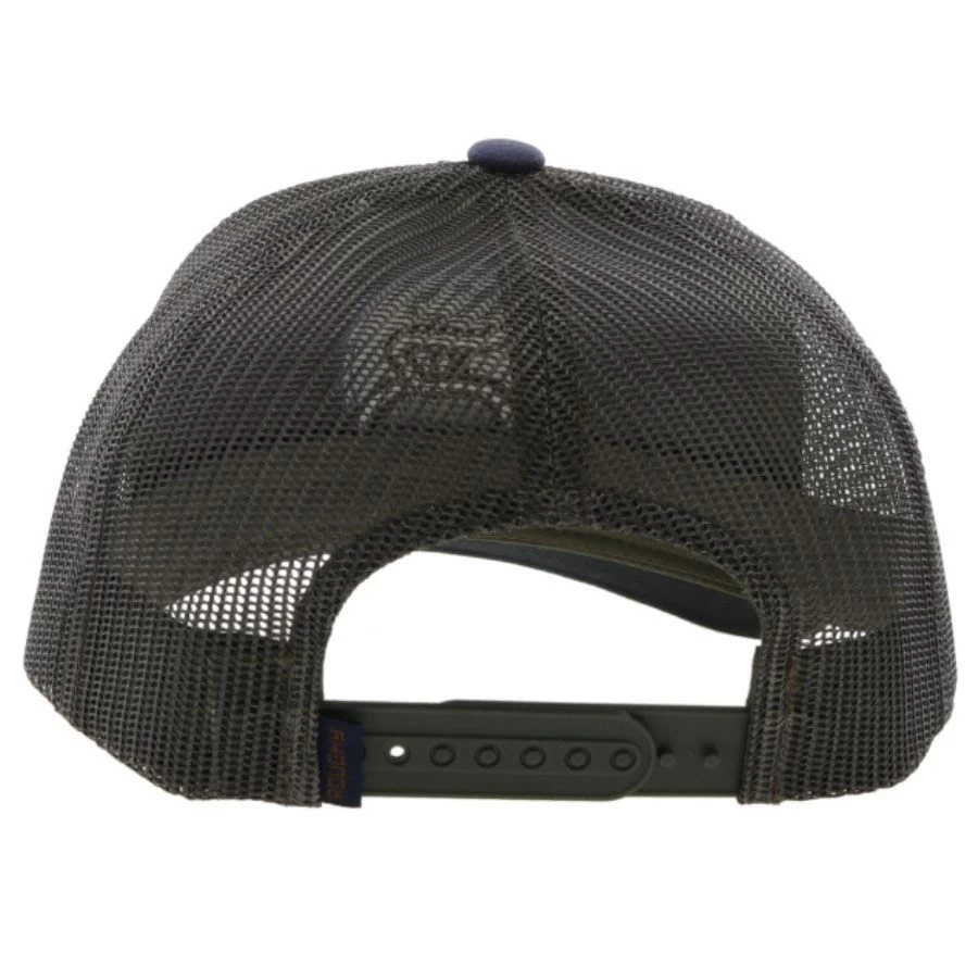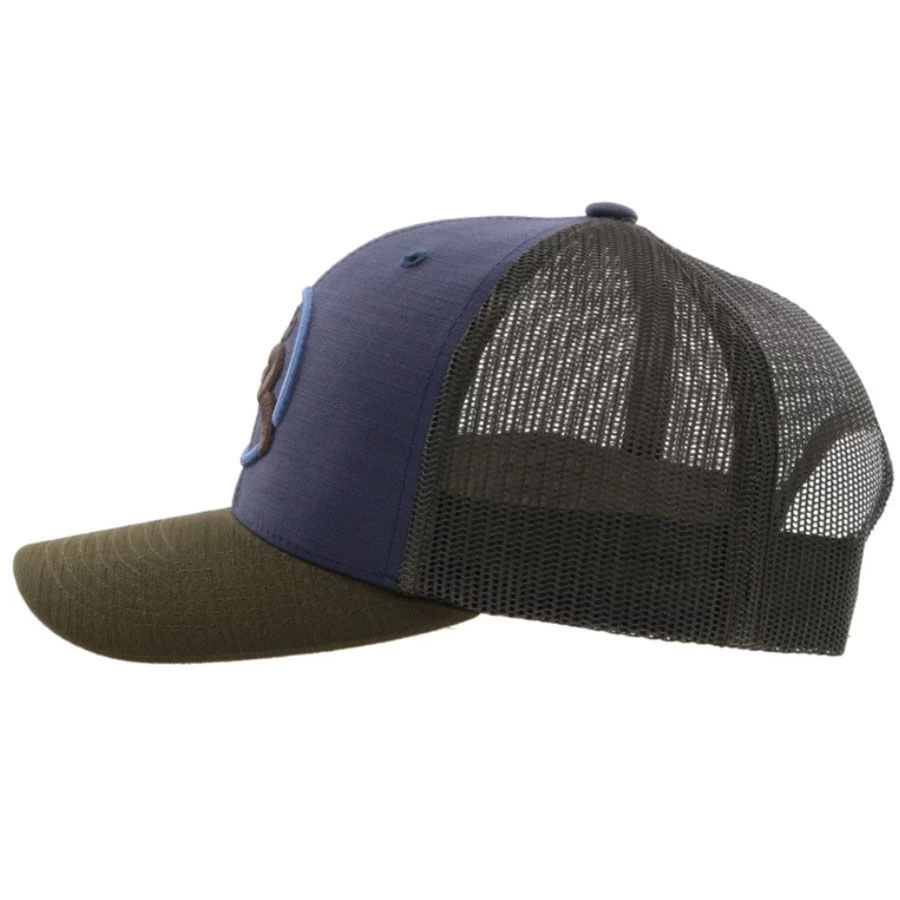 The Hooey “Strap” Roughy Trucker Hat in Olive Green and Navy features a black and blue contrasting logo on a navy background. The bill of the hat and back mesh is finished out in olive green. This mid profile hat as a one size fits most with 6 panels and snap closure. With a traditional front bill and back mesh, this hat is comfortable and breathable.