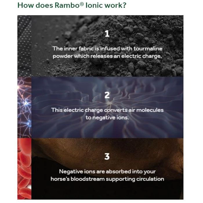 Ionic Stable Sheet can be used by itself or underneath another blanket. Rambo Ionic Sheet can be used before and after exercise to relax muscles and to help reduce lactic acid build up. Promote circulation with Ionic technology. Rambo Ionic Stable Sheet can be used inside or during shipping. Rambo Ionic harnesses the power of tourmaline, a naturally occurring crystal that, when ground down to powder form, releases an electric charge which converts the surrounding air molecules to negative ions. These negative ions are absorbed by the body and impact the size of the water molecules in our blood stream. They reduce its physical size by neutralizing the waters natural positive charge which allows the water molecule to flow faster through our bodies, thus bringing increased oxygen and nutrients to the muscles. Negative ions for positive results.