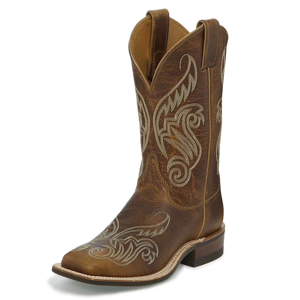 Justin LLano Ladies Western Boot embraces the Old-West spirit with modern Cowgirl elements! The 11-inch tall boot is made from distressed tan leather and accented by bold stitch patterns on both the upper and foot, a whimsical almost butterfly-wing like effect. This classic western boot is built for comfort with a broad square toe, standard heel, and J-Flex Flexible Comfort System insoles with a cushioned horseshoe midsole for maximum support. Perfect for work, play, riding, and everyday living, experience the proven quality and craftsmanship Justin Boots offer.