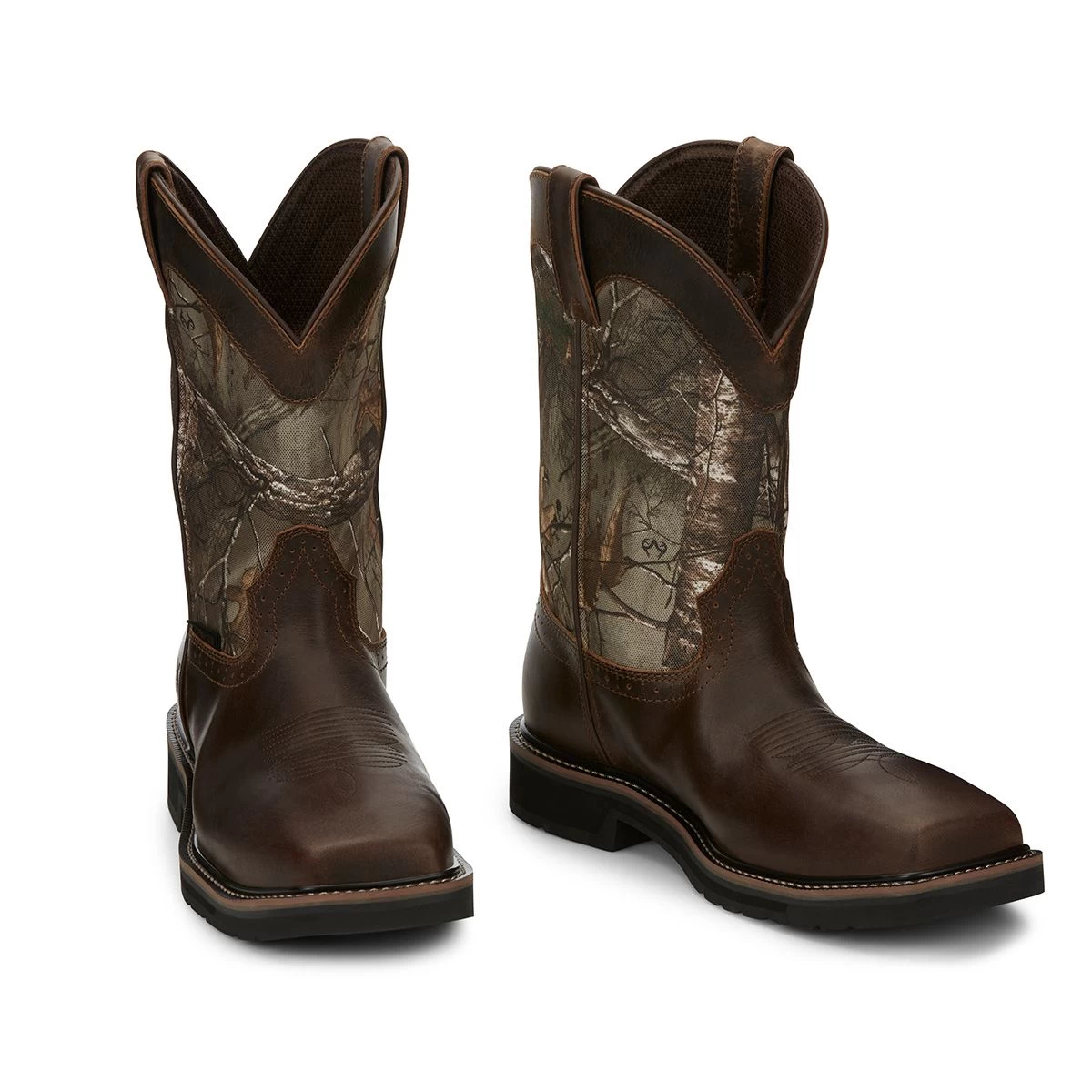 Justin Trekker Waterproof Composite Toe Mens Western Work Boot is built for comfort and durability featuring a waterproof exterior and composition square toe that meets ASTM F2413-11, I75, C75 EH safety footwear standards. The J-Flex comfort system insole cushions and supports your foot guaranteeing lasting comfort. Polished brown leather is accented by RealTree Mini X-Tra camo upper for an attractive look in a boot built designed for lasting durable comfort.