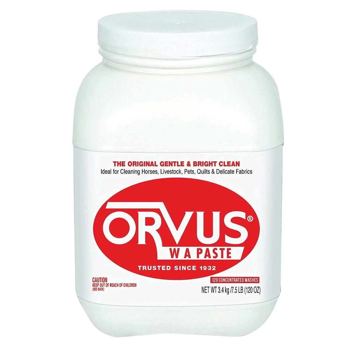 Orvus WA Paste Shampoo is a concentrated, pH neutral cleanser that will leave your horse sparkling clean after bathing. Only 2 tablespoons of Orvus per 5 gallon bathing bucket is all you need. This multi-purpose cleaner is also an effective detergent that can be used for hand washing or machine washing wool, cotton, nylon, polyester, fleece and other fabrics. It’s safe for HE (high efficiency) Machines too.