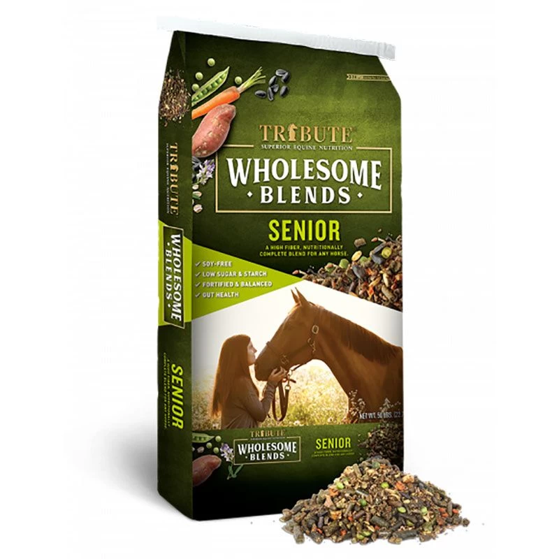 Senior formula by Wholesome Blends is a low sugar and starch formula that is fortified and balanced with essential vitamins, minerals and amino acids. High in fiber (20% crude fiber) and fat (8% crude fat). Low in sugar and starch, having a NSC level of 16.5%. Fiber from beet pulp, sweet potatoes and alfalfa are great for older horses. Fat from canola oil, whole flax, black oil sunflower seeds and rice bran are ideal for keeping weight on. Wholeblends Senior combines pre/probiotics along with digestive enzymes for an overall healthy gut. This soy free formula, gets high quality protein from peas, linseed, canola and alfalfa to maintain muscle mass.
