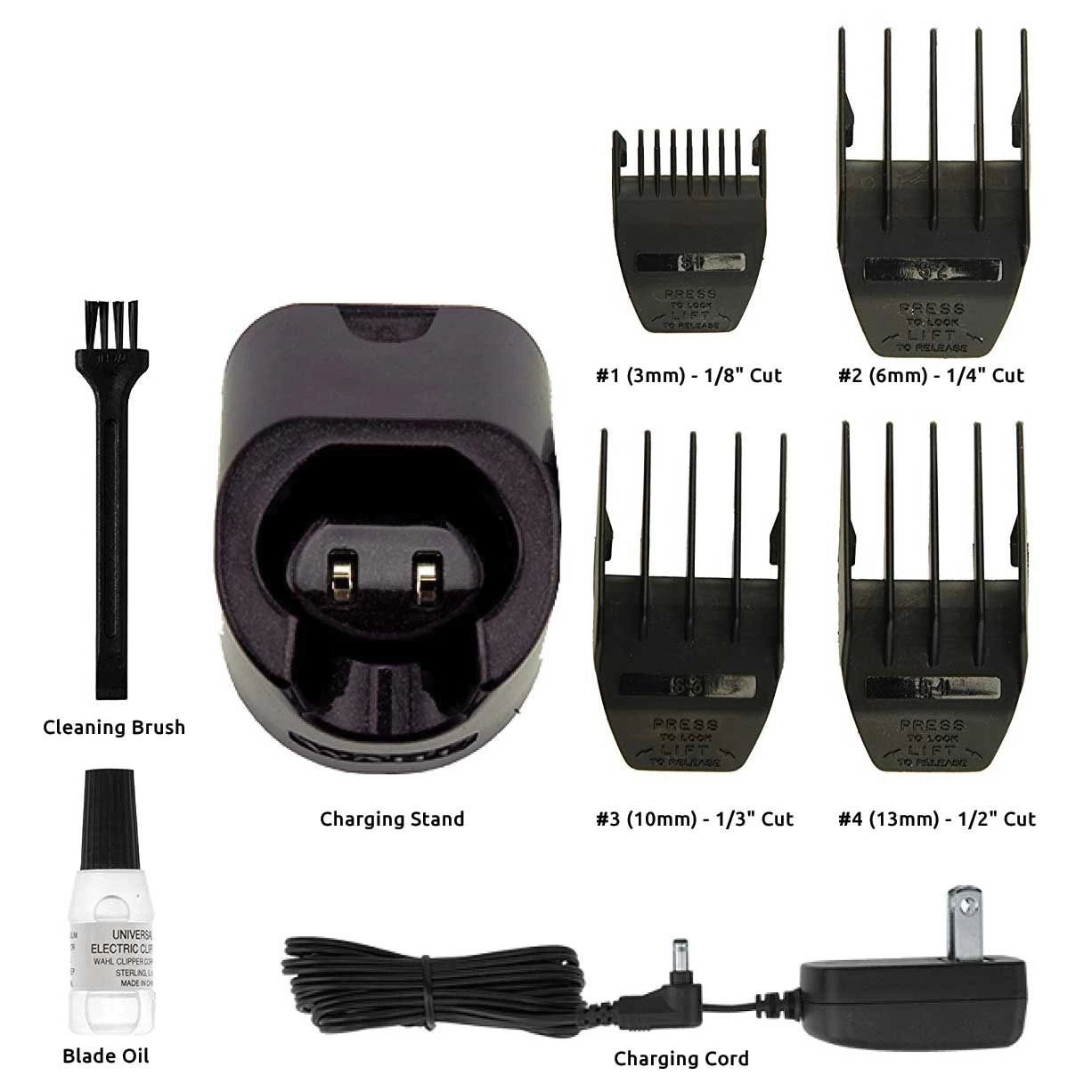 - Kit Includes: Charge Stand, 4 Attachment Guide Combs 1/8″ cut, 1/4″ cut, 1/3″; cut & 1/2″ cut), Blade Oil, Cleaning Brush & Instruction Book