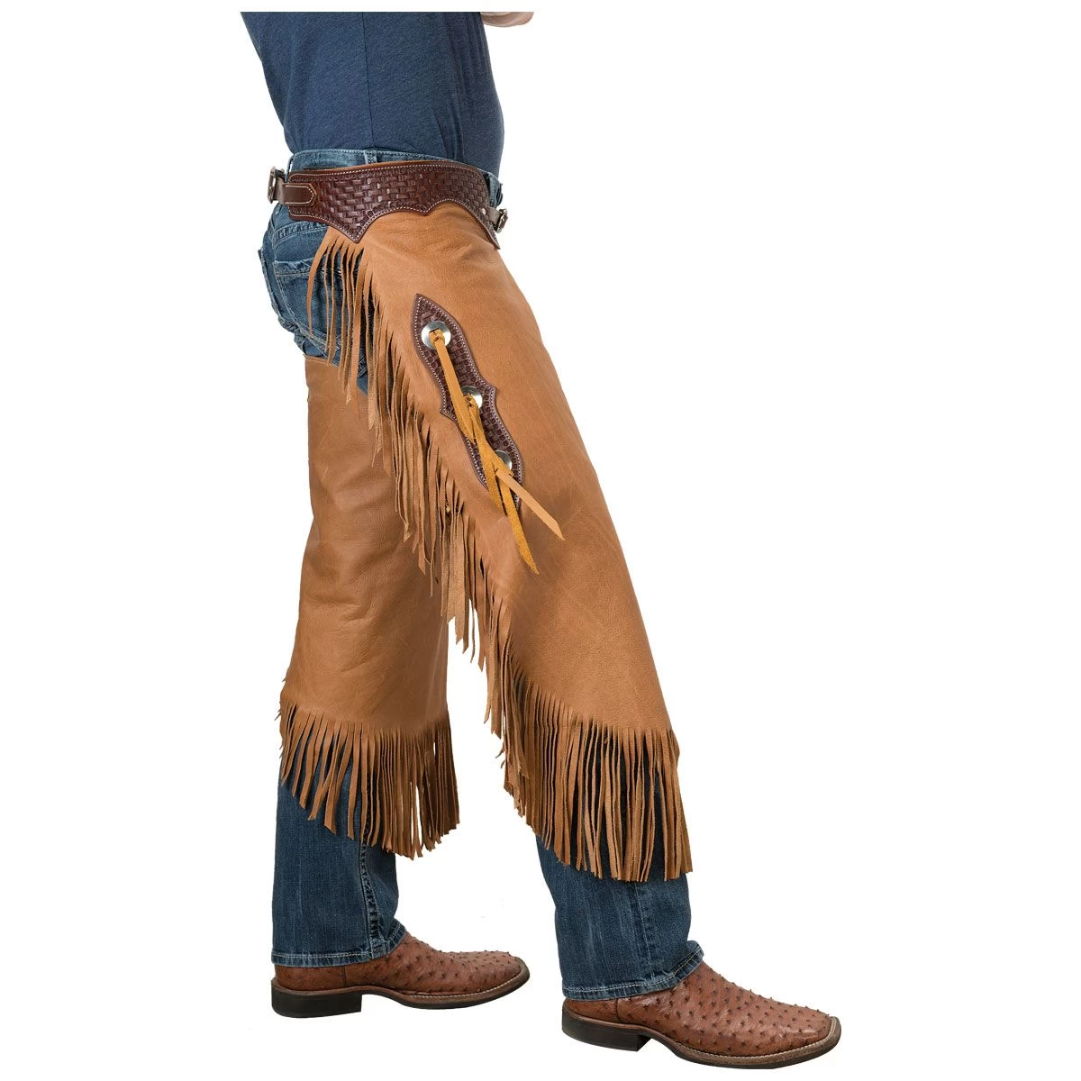 Weaver Belt Style Leather Chinks with Basketweave Yoke are handcrafted by skilled Weaver craftspeople offering a versatile design featuring chrome tanned top grain leather, basketweave tooled yoke and leg scallops and stainless steel conchos with ties for a true vintage cow hand look. Chinks should sit just below the knee but above the ankle and are fastened around the leg by snaps allowing the chink to swing freely. Chinks are a great addition to your working cowhand apparel and are perfect for a variety of western disciplines offering protection for your jeans. Chinks are also an excellent accent for ranch pleasure for an authentic working cowhand look for both men and women.