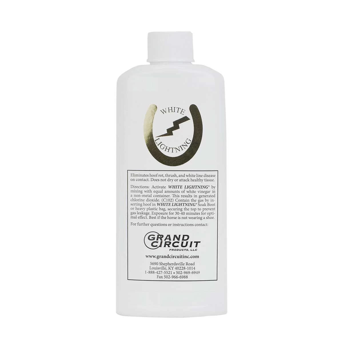 White Lightening Liquid When mixed with equal parts of white vinegar, the solution will produce chlorine dioxide. Chlorine dioxide is very aggressive in neutralizing bacteria, fungus and yeast, and has been proven to be highly effective in the treatment of White Line Disease, Thrush, and Hoof Rot.. White